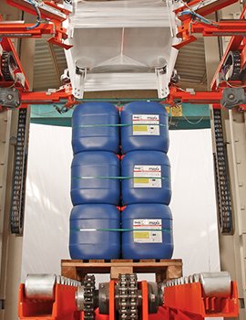 The pallet packaging process takes place without the participation of hot air. There is no need for heat because the stretch hood film has a memory and so it’s coming back to it’s prior size after it has been stretched.