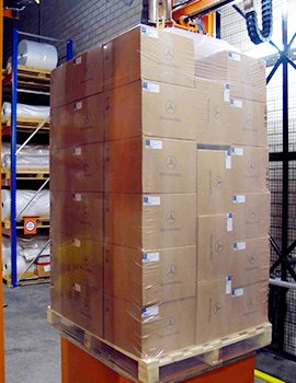 Automotive parts transportation solutions, optimized for compatibility with automated wrapping machines.